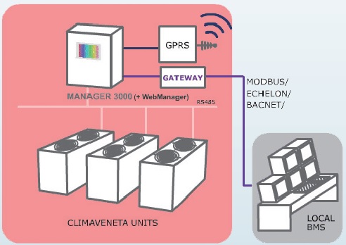 通过MANAGER 3000,可与BAS/BMS管理系统进行通讯可支持: MODBUS通讯协议的串口模块,LONWORKS通讯协议的模块,BACNET通讯协议的模块