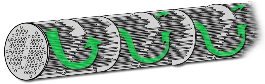 1、采用壳管式非对称结构设计,即气态、液态制冷剂通过传热铜管流通截面积不同,使制冷剂无论在液态或气态时都在均匀的流速下循环运行,因而不仅使冷媒能够充分蒸发,又使回路的循环阻力减小。
